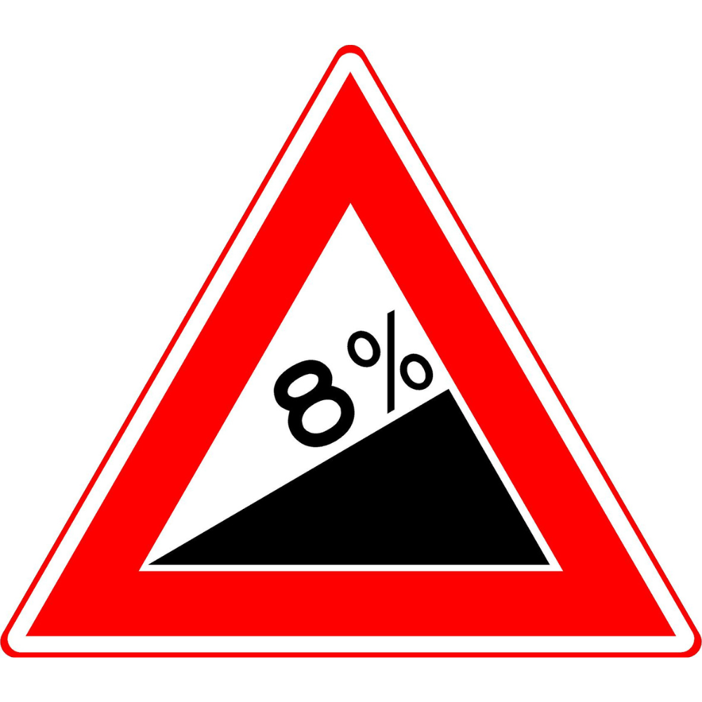 Dit officiële verkeersbord J06 waarschuwt voor een steile helling. U heeft de mogelijkheid zelf het percentage aan te geven.