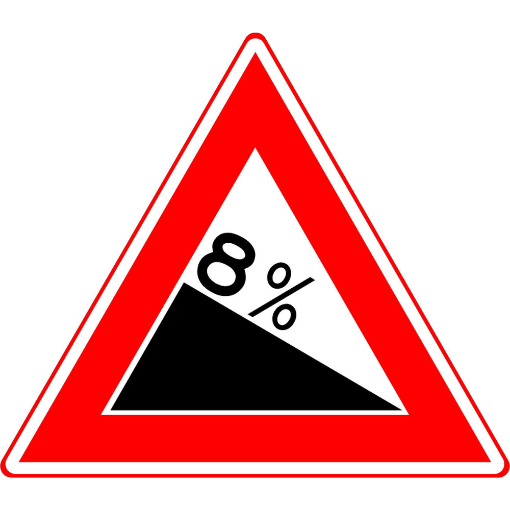 Dit officiële verkeersbord J07 waarschuwt voor een gevaarlijke daling. U kunt zelf het percentage aan te geven.