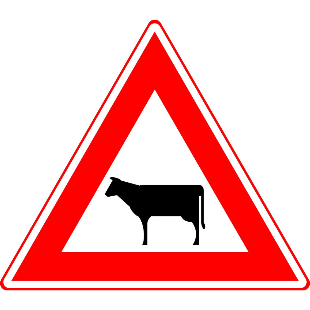 Dit officiële verkeersbord J28 waarschuwt voor loslopend vee.